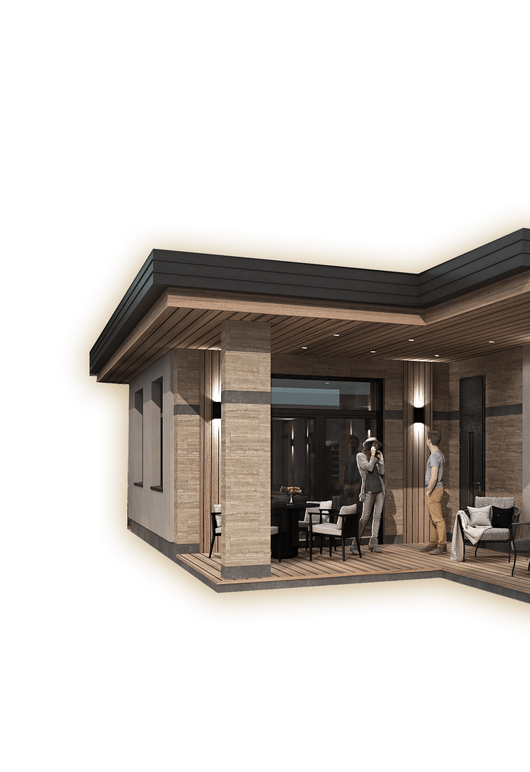 Тщательно продуманное расположение просторных комнат, высокие потолки, большие кухни - студии, зона барбекю и терраса в каждом доме